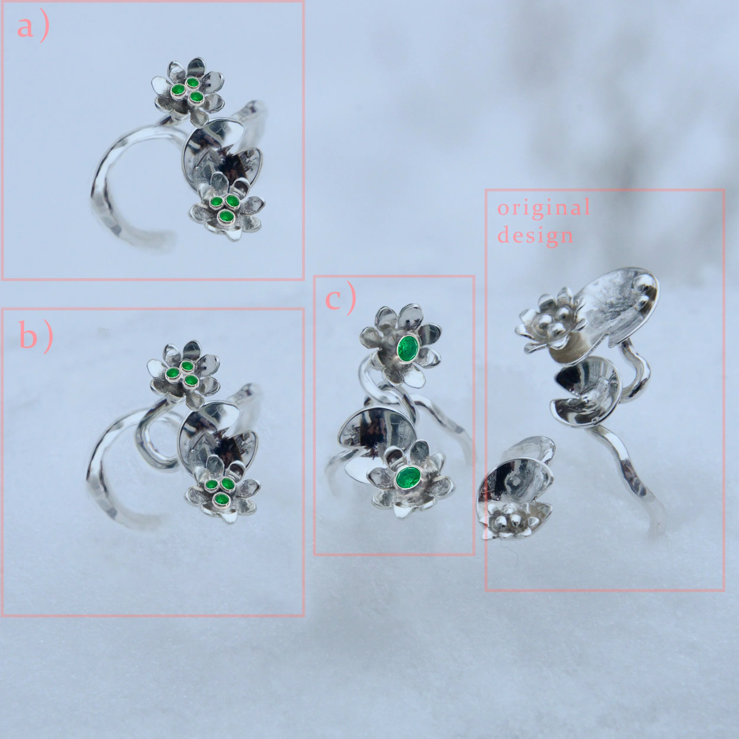 This ring was designed for a happy bride who had fallen in love with the lily pad ring but wanted something smaller and stringer for her wedding band. We helped her pick out gemstones to add and gave her options regarding how the design could be changed around.