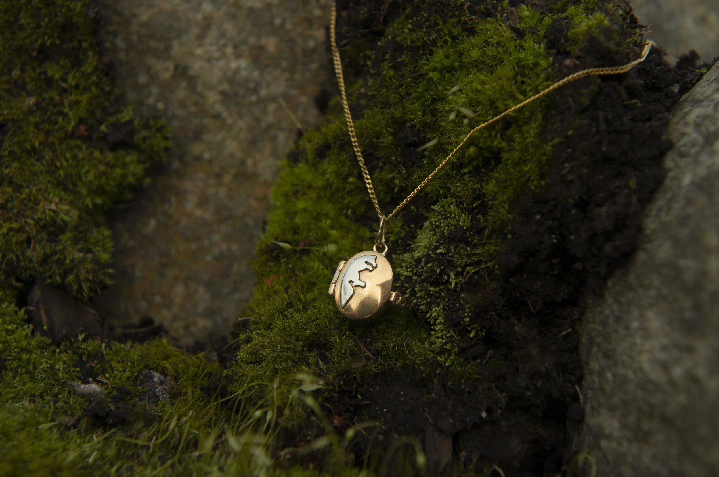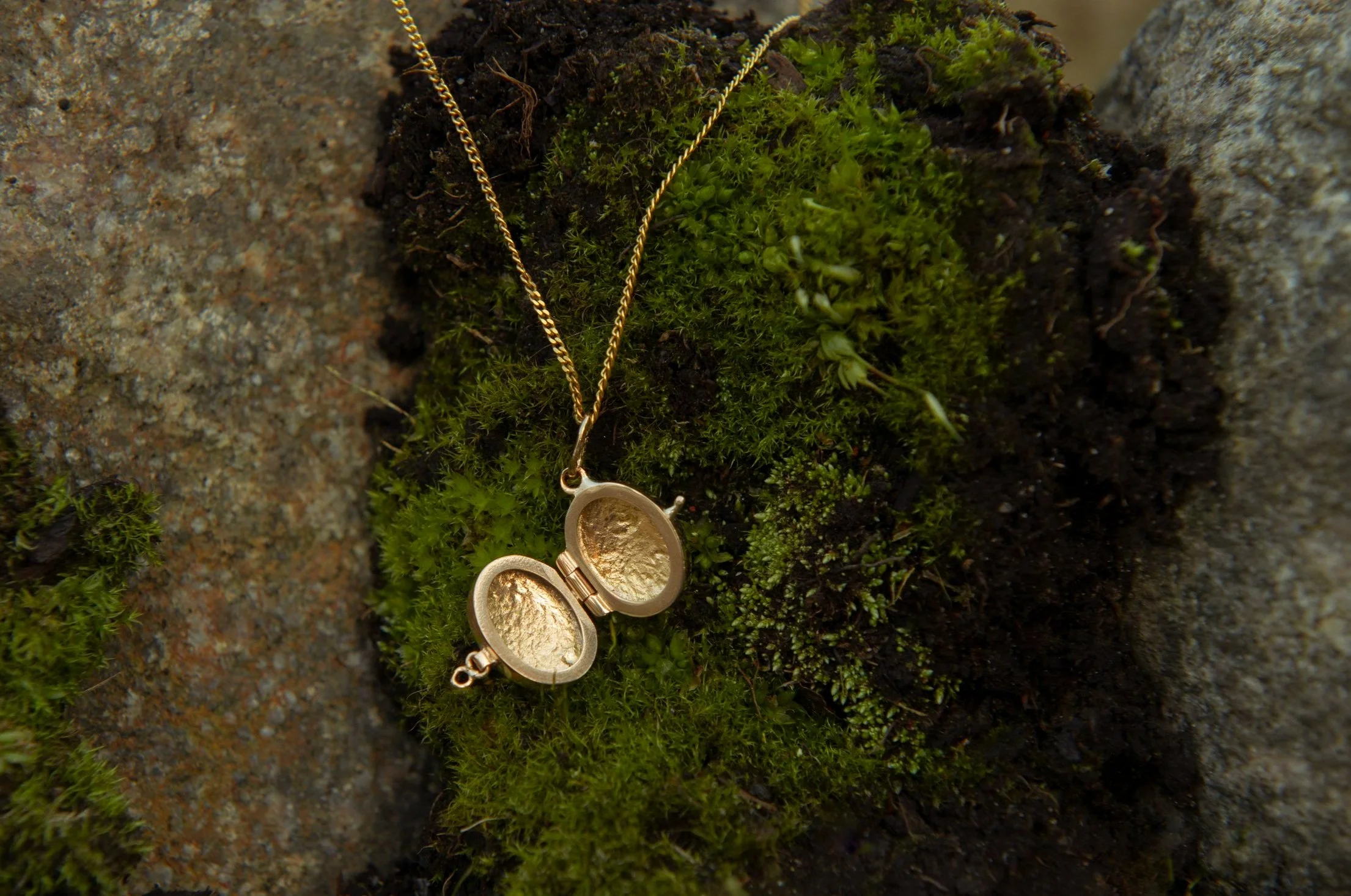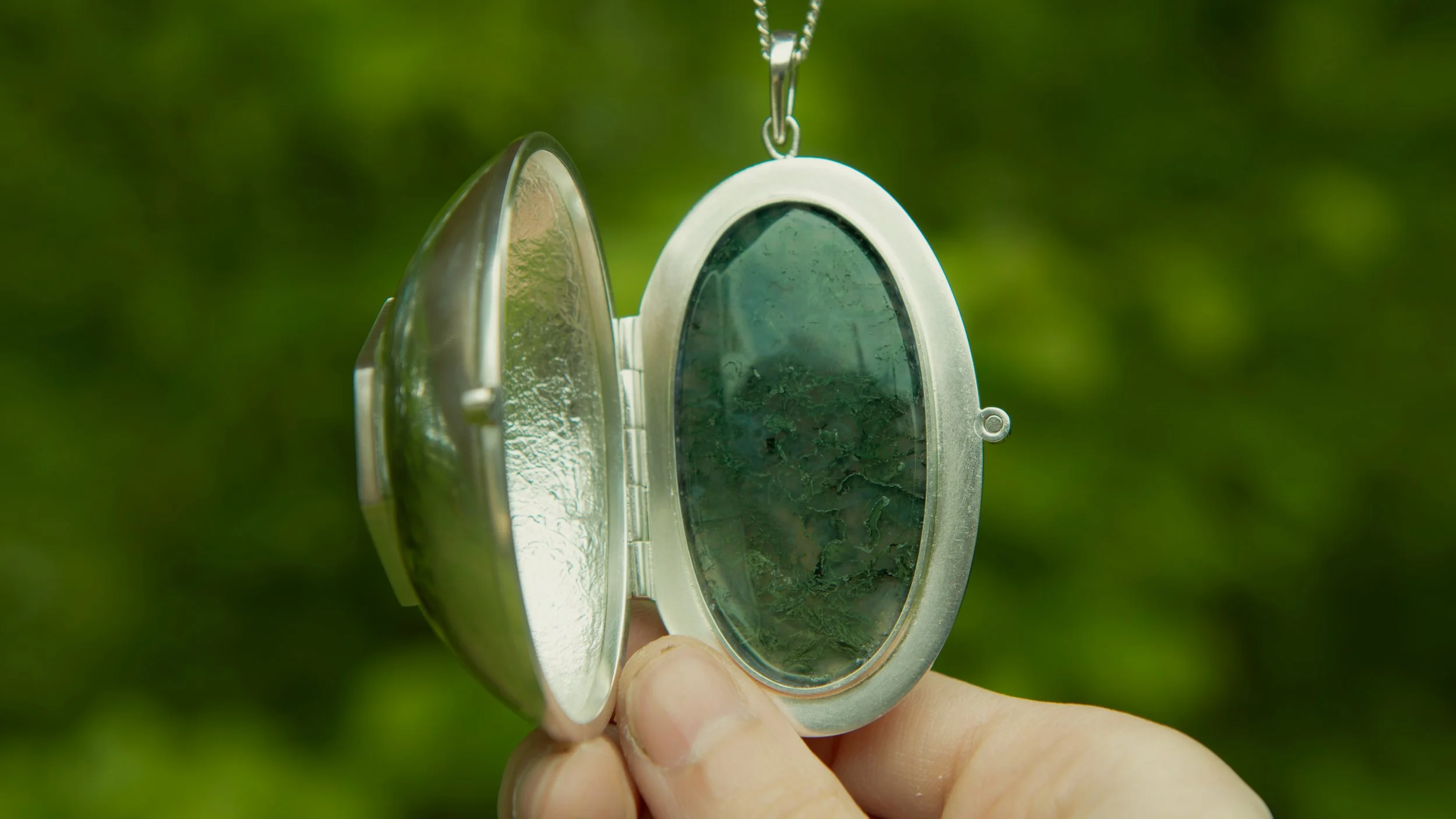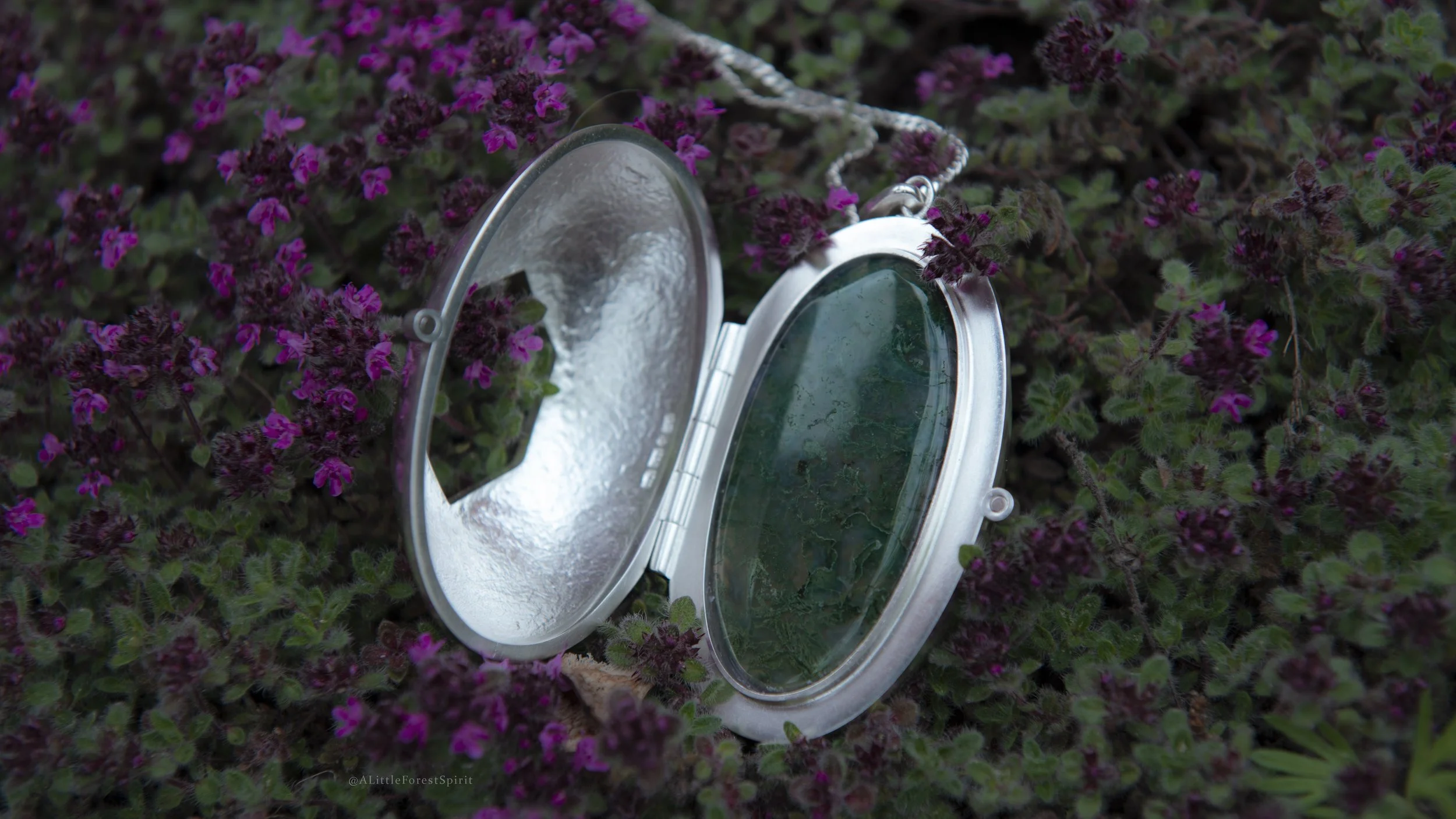 The big moss agate sits behind a silver window, like a portal to the moss-covered Swedish wilderness. The silver on the inside of the lid of the locket is textured to emphasize the rugged nature of the wilds. I know I carry a piece of that magical forest with me wherever I take this locket.