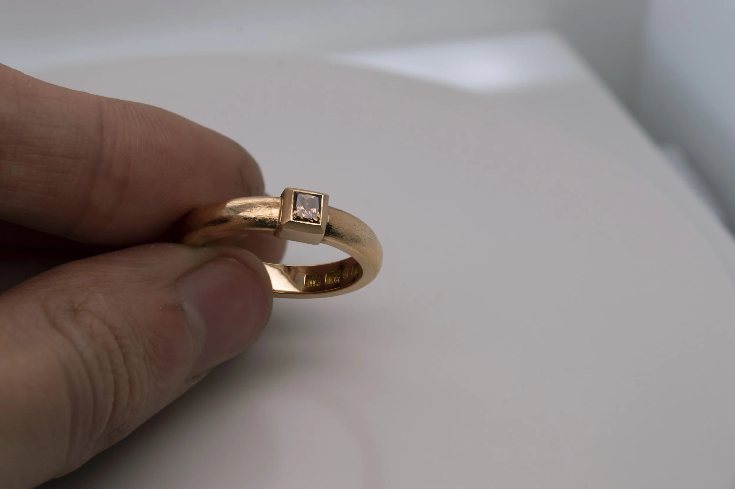 I designed this 18k gold wedding ring for a client who wanted something clean, angular and elegant, yet unique and playful. The textured ring band sparkle just beautifully and creates a fun contrast to the shiny smooth metal on the inside/around the rock. The brown coffee diamond brings out the vibrant red undertones in the gold and creates the rich autumnal depth the costumer was looking for.