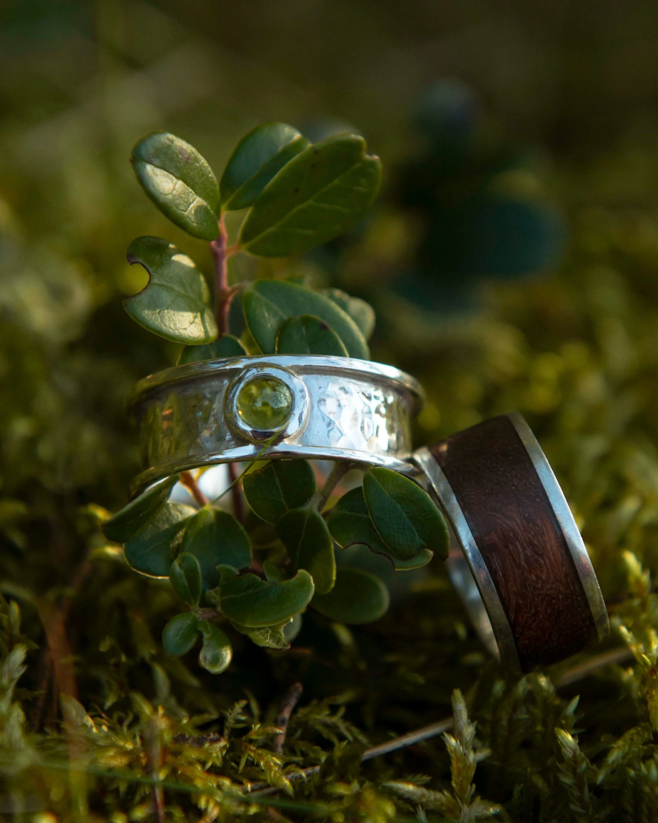Materials: 925 silver, peridot, padauk wood rings